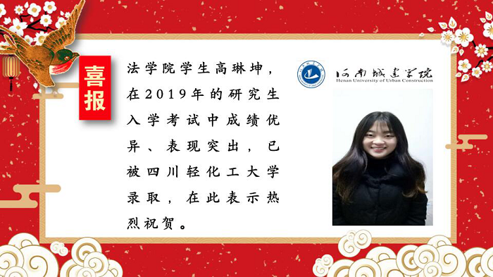 (通讯员:孟素燕 尚维潇)多年来9428cn太阳集团古天乐一直坚持推进学风建设,积极鼓励考研,营造良好的学习氛围。近期,9428cn太阳集团古天乐2019届考研学子喜报频传,录取人数再创新高。据悉,高琳坤同学已被四川轻化工大学录取,在此表示热烈祝贺。